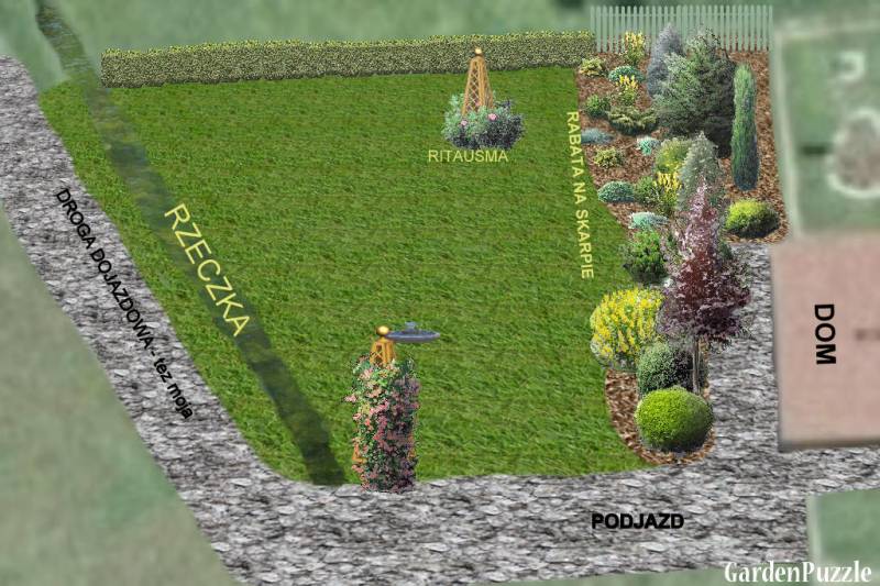 Wygląda to mniej więcej tak: DOM, RABATA NA SKARPIE, ŁĄCZKA, STRUMYK... a ten na wiosnę lubi czasem wylać aż na łączkę... Może Wam przyjdzie coś sensownego do głowy?