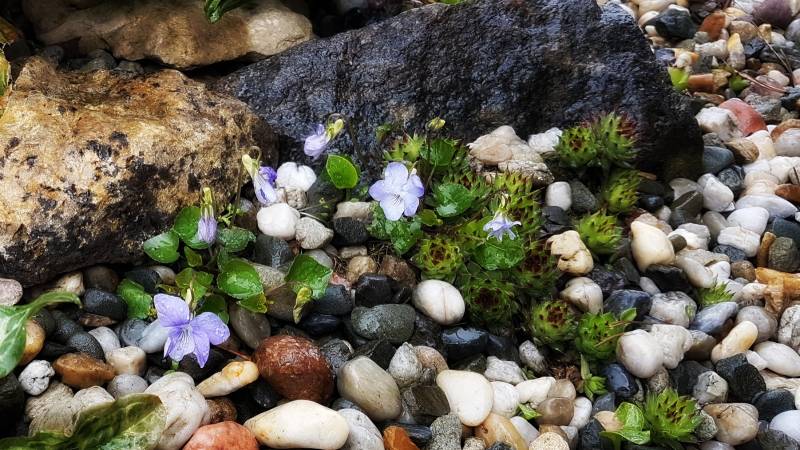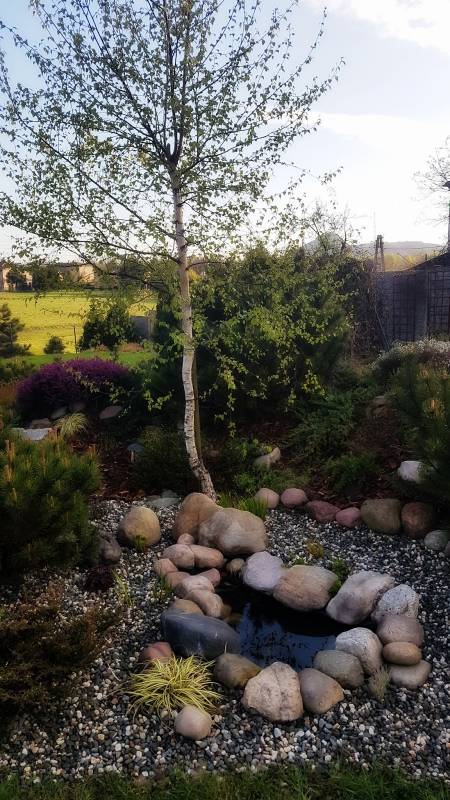 Mój M. chyba wziął sobie bardziej do serca to moje ogrodowanie i pomógł mi przerobić to małe oczko - wcześniej było obłożone tylko otoczakami, ale pies który polubił picie wody z tego miejsca ciągle je zrzucał. M. przytargał ze skalniaka płaskie kamienie granitowe. Są bardziej płaskie i stabilne. Pies się cieszy, a ostre krawędzie starałam się złagodzić otoczakami. Na razie tak musi być i już.