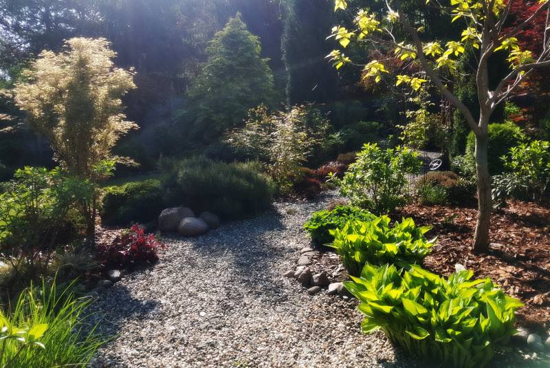 Tnę, sprzątam i sprzątam, i wycinam, bo mróz zniszczył mnóstwo wrzosów i wrzośców - już wywaliłam blisko 20 a to jeszcze nie koniec, wymarzł nawet ubiorek wiecznie zielony, a przecież taki odporny, padły wszystkie turzyce "Ogień Prerii" w ilości 15 sztuk... przesadzam i dosadzam... zmieniam koncepcje. Wywaliłam 4 berberysy (bez większego żalu) no i zostało puste miejsce. Dzięki wycince wreszcie się odsłonił dereń kwiecisty rosnący pod płotem, no i zyskałam dużo miejsca na byliny. W planie jest rabata w odcieniach niebieskiego i fioletu i różowości, choć w tle będą rosły dwie pnące róże Moonlight i Maigold, ale one mają różowe obrzeża płatków, więc może jakoś to się wpasuje., tym bardziej, że pod płotem rosną clematisy "made in LIdl" w kolorze fioletowym, więc może przełamią tę żółć?