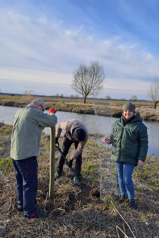 Trochę z łapanki sadziliśmy te drzewa. Jedziemy sobie wałem na kwaterę, a tu z dołu nawoływania, że co tak sobie wygodnie jeździmy zamiast pomóc. To byli nasi gospodarze - Iza i Jacek, którzy z gośćmi z innego pokoju sadzili 3 drzewa. No i chcąc, nie chcąc poszliśmy po żywokoły, siatkę. Ja najpierw wierciłam otwory, dość głębokie na ok 70-80cm. Chłopaki sadziły i zakopywały. Potem przygotowanie i osadzanie siatki. Ot mała przygoda z nadzieją na szum gałęzi w przyszłości.