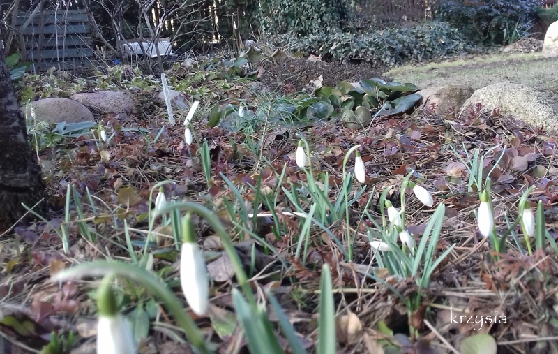 , oznaki wiosny pojawiły się i u mnie, krokusy, iryski i cebulice jeszcze w stanie szczypiorków, zakwitły ciemierniki białe i przebiśniegi, które trzeci już rok po przesadzeniu wegetują