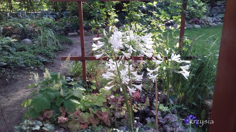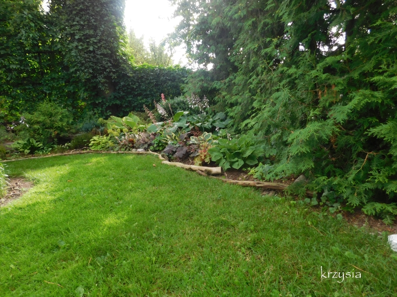 Pokazywałam już co się znajduje na lewo od furtki: skalniak, rabata z rh, liliami i liliowcami oraz ścieżka wzdłuż tuj w głąb ogrodu.