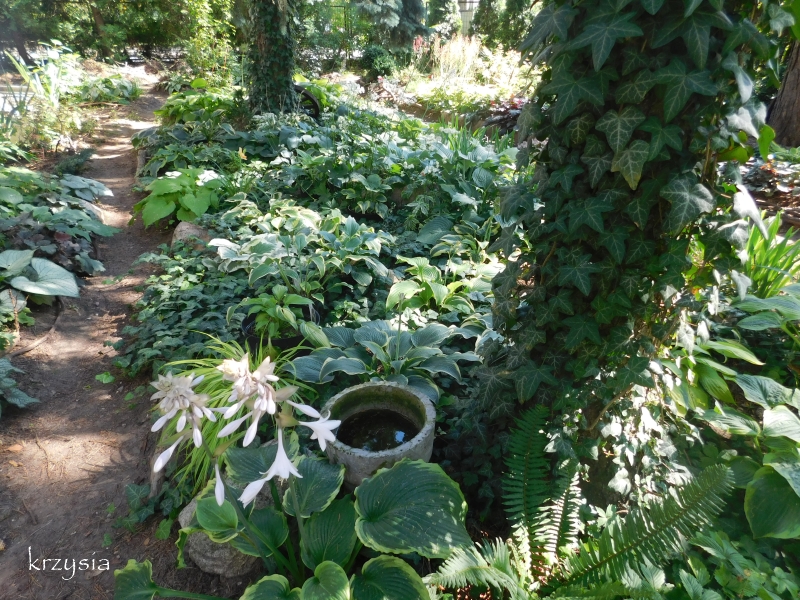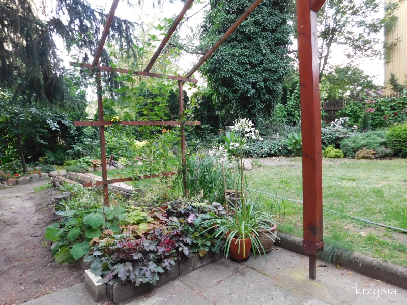 W kącikuku między tujami, a podkładem posadziłam hosty i żurawki, głównie w donicach.
