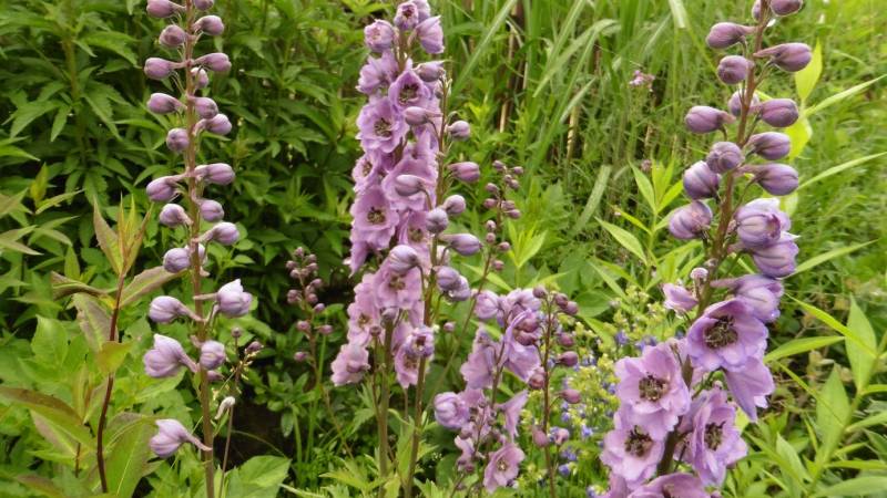 Teraz tylko od czasu do czasu go przestawiam. Ogród jest więc zielony, skutków suszy nie widać. Hosty są wielkie, pierwsze dalie kwitną