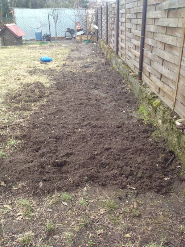 Jako pierwsza powstała rabata pod płotem. Docelowo miały tam trafić moje balkonowe klematisy i róże.