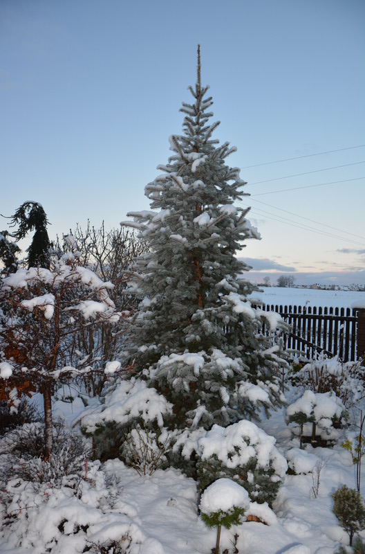 Lekki mrozek (jakieś -1), do tego co chwila wychyla się słońce, smniegu akurat tyle, żeby okryć co wrażliwsze rośliny, więc tylko się cieszyć