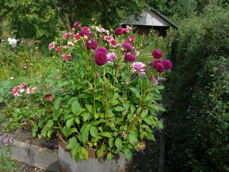 Na dalie mało miejsca mam, ale są, te rosną w beczce, dużej beczce
