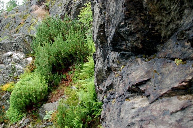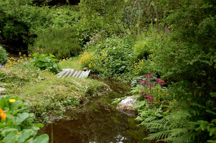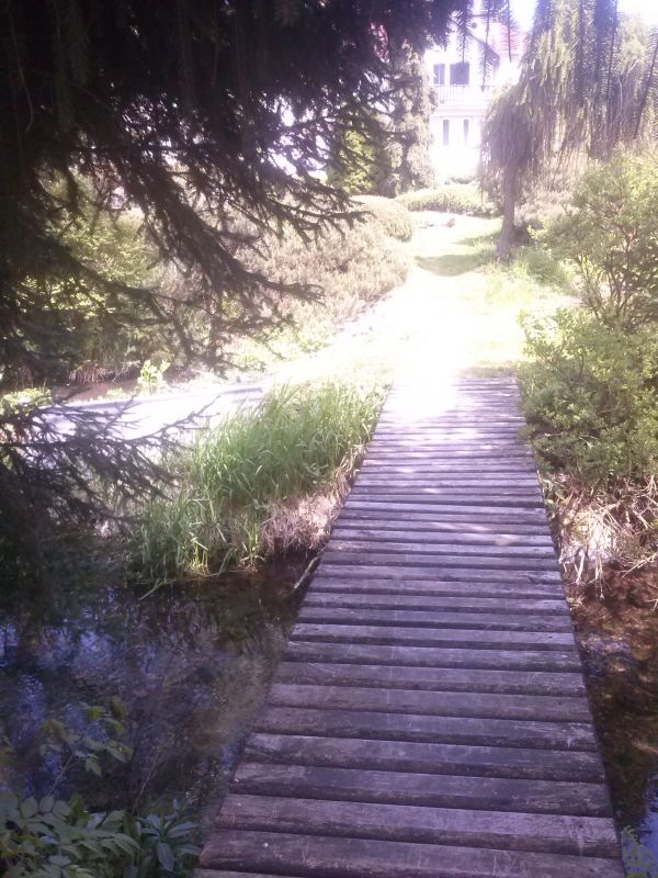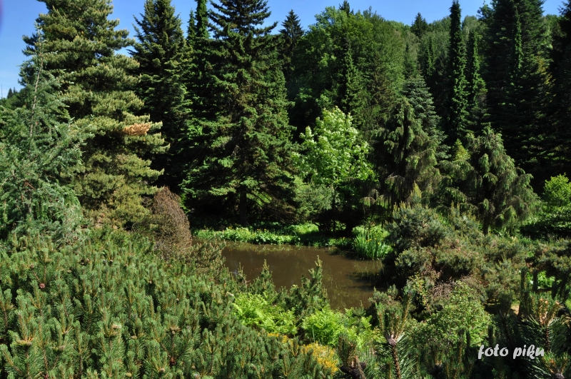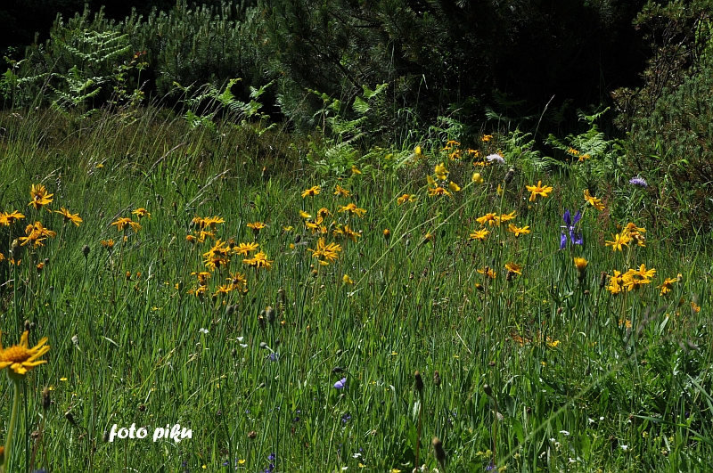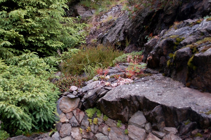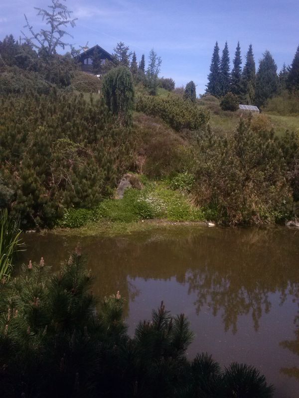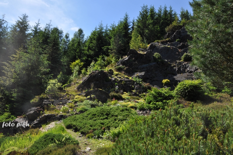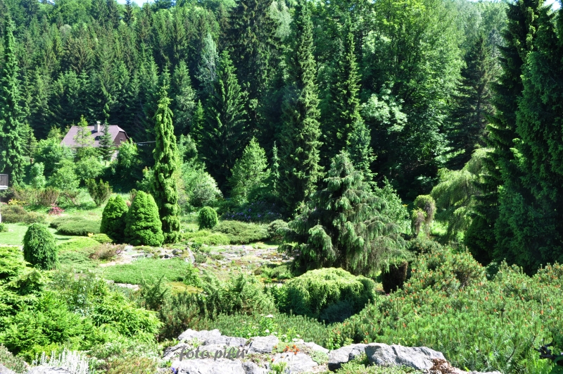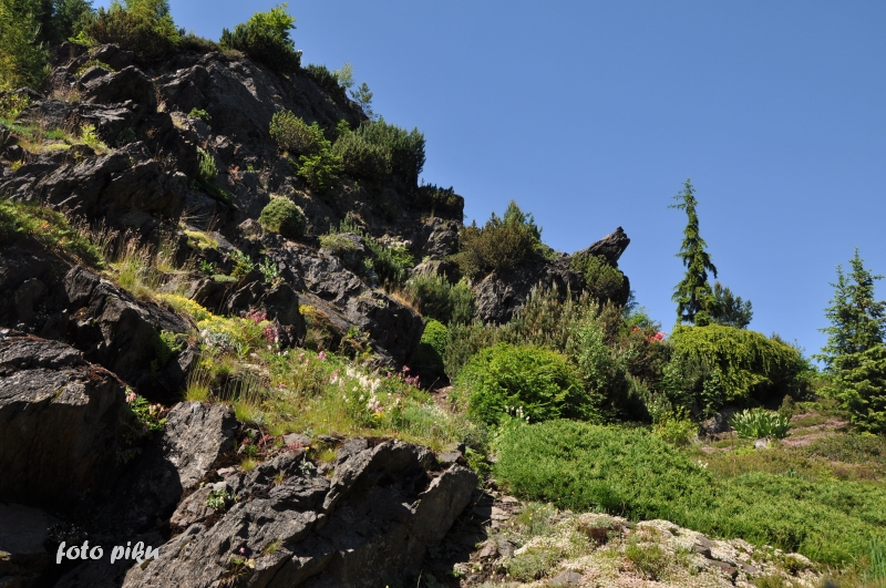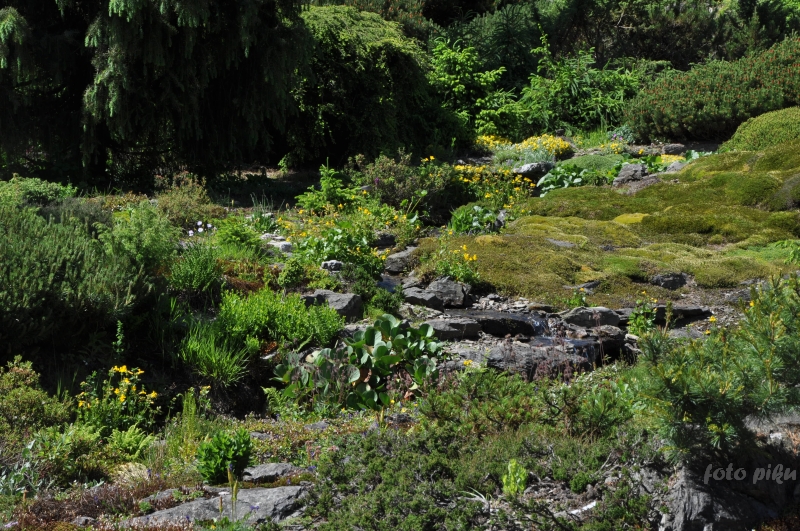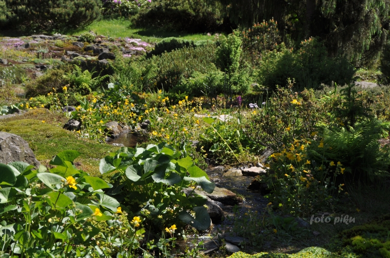 W sumie, relację zaczęłam od końca, bo wzniesiona część alpejska z ostrą skałą na szczycie , to korona tego ogrodu. Wcześniej jednak, idąc od domu pani Marii, mijamy część nadwodną, połozoną przy stawie i górskim potoku. Możemy tu podziwiać rośliny wodne, bagienne, ale i cienioluby . Nad potokiem zadziwia feeria barw kolorowych , płożących dywanów, utworzonych z roślin skalnych.