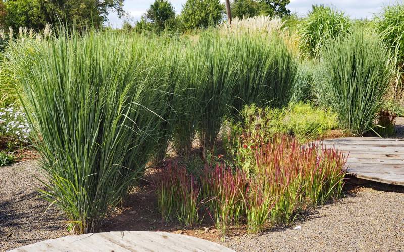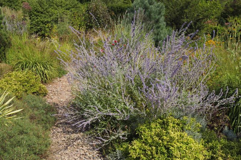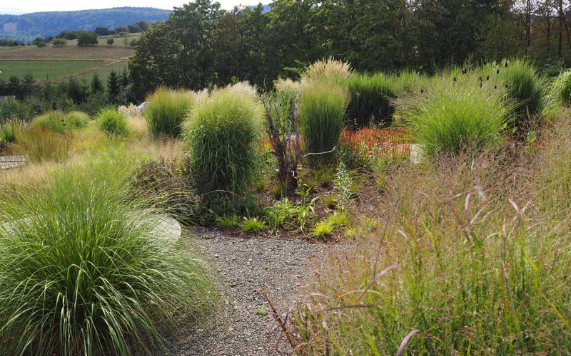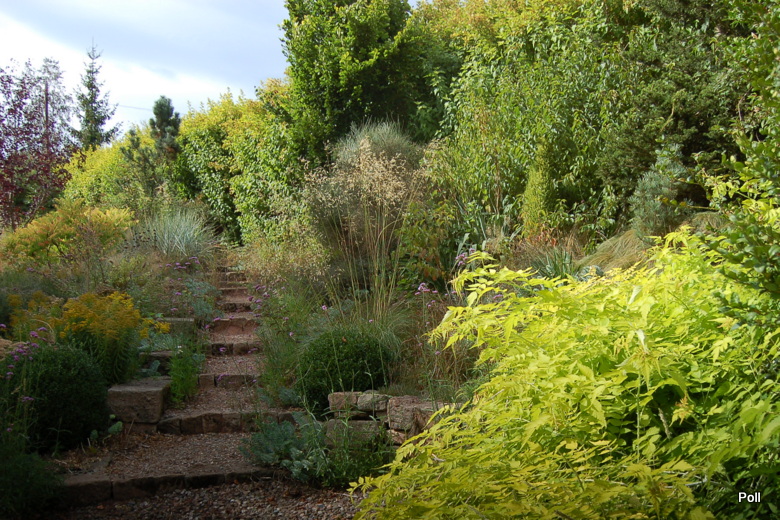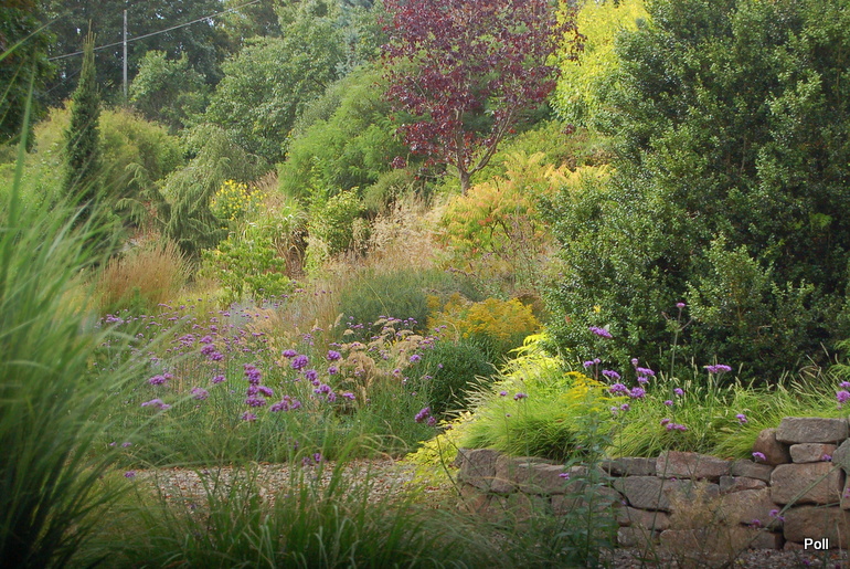 Tymczasem, znaleźliśmy się w pokoju preriowym...Na lewo od ściezki podniesiono nieco skarpę tworząc prostokątny placyk, wokół którego zbudowany jest kilkuwarstwowy murek z prostokątnych kamieni. To właśnie miejsce skupia wiele gatunków i odmian roślin, które kojarza się nam z typową prerią. Własciciele podkreslili ten charakter ściółkując glebę nieregularnym żwirem