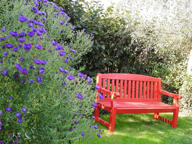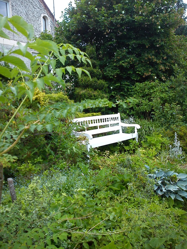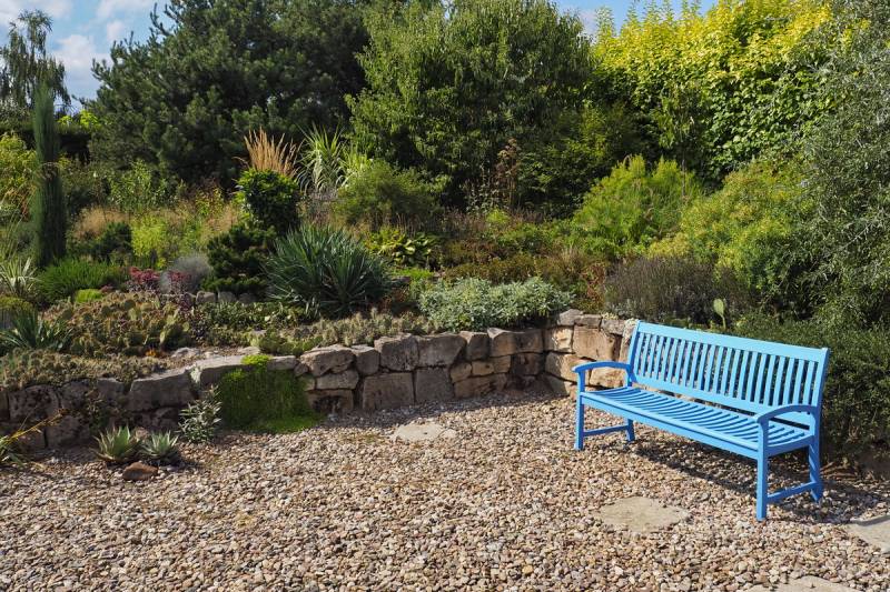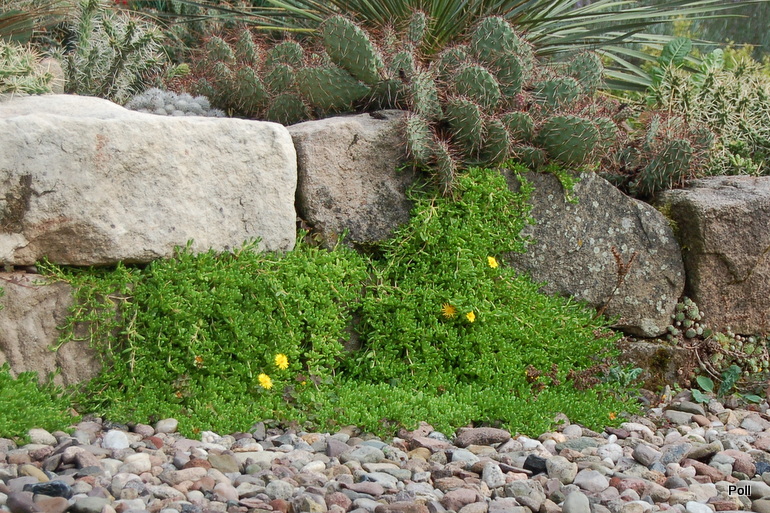 W centrum, pod murem ustawiona jest ławka, na której możemy usiąść, by w spokoju oglądać zgromadzone tu rośliny i podziwiać sposób ich nasadzeń, bowiem oprócz roślin wyeksponowanych na podniesionej skarpie, wypatrzeć mozna sporo dość pospolitych gatunków, których siła polega nie na urodzie a sposobie rozrastania się. Wetknięte w szczeliny muru spływają w dół, lub tworzą coraz to większe kolonie , wchodząc niemal jedne na drugie.