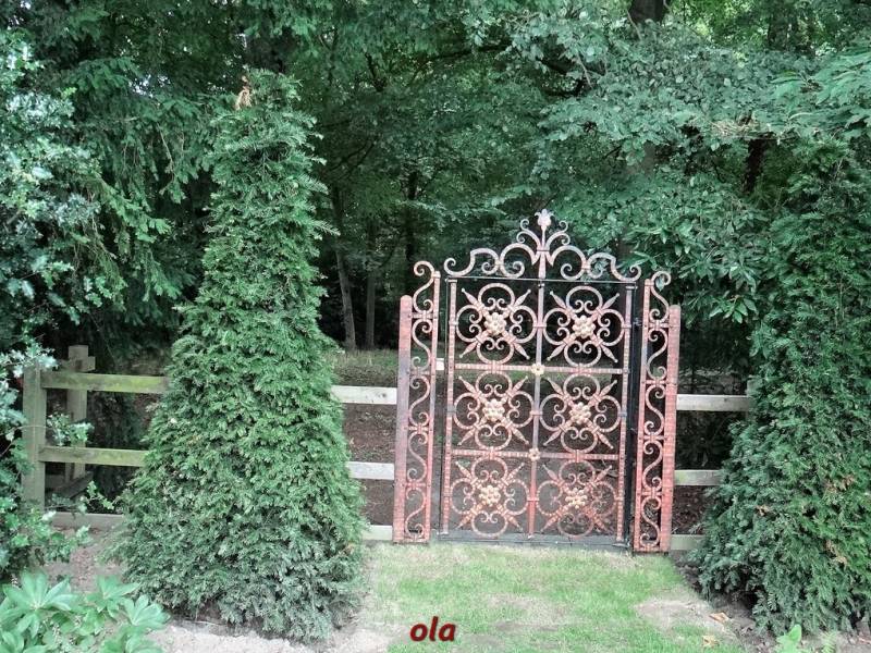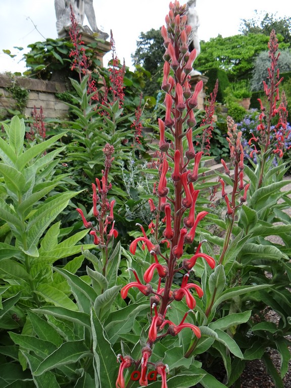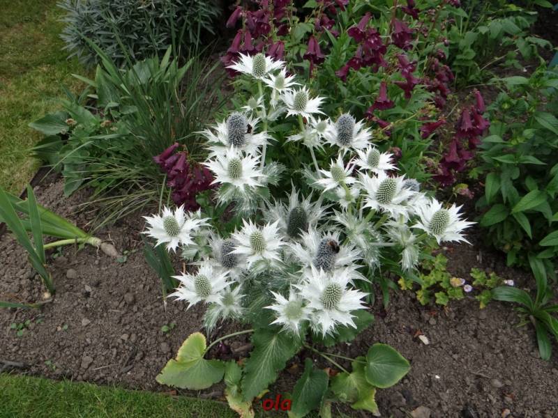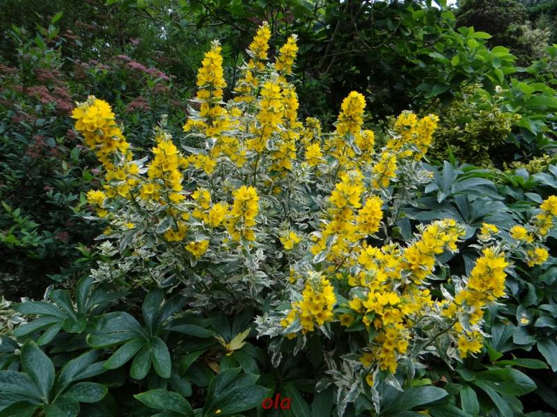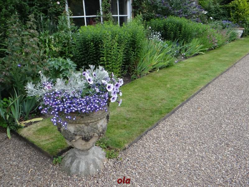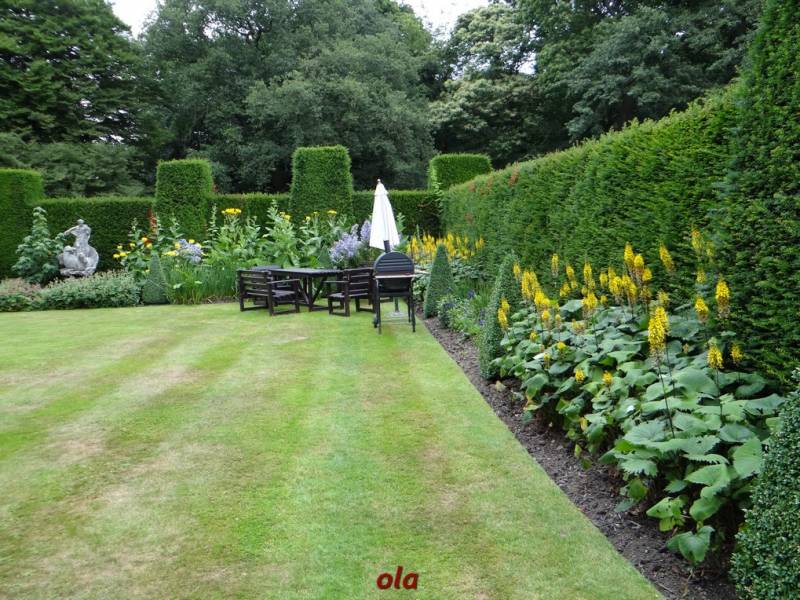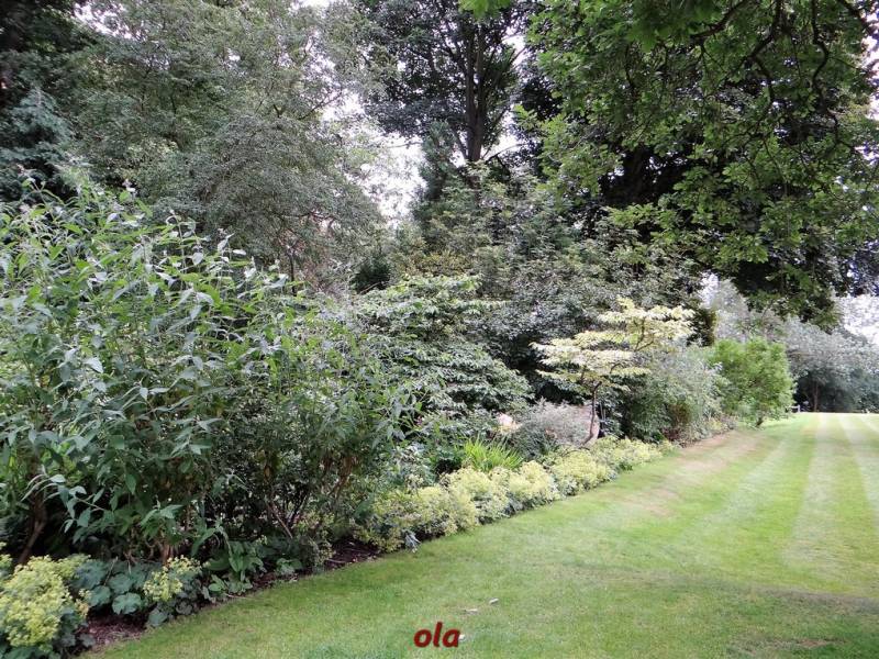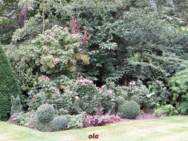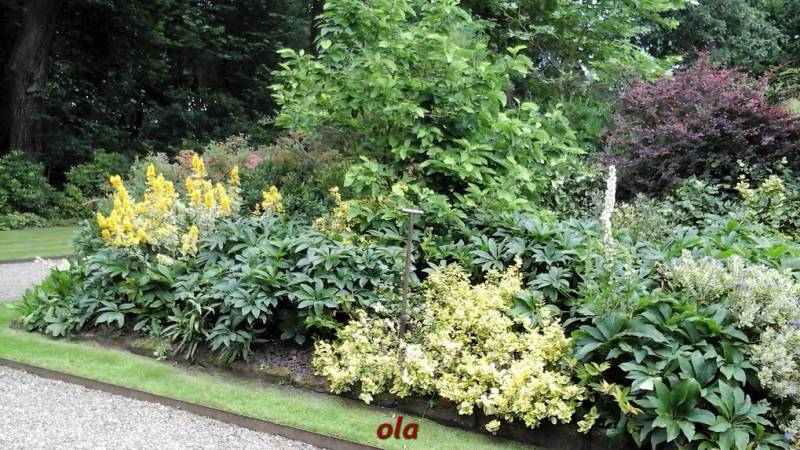 Na tle żywopłotowej zieleni mamy naturalistyczne nasadzenia dużych bylin ( ostróżki , naparstnice ....) i krzewinek i krzewów ( róże , jaśminowce ).
