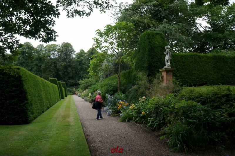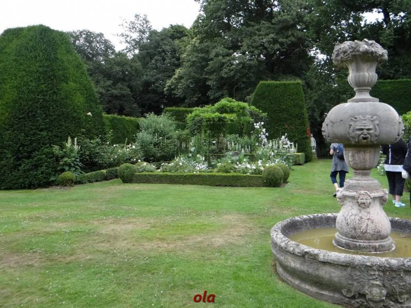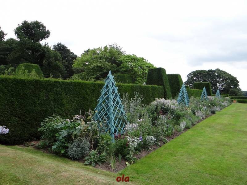 Ogród ma geometryczny układ . Wysokie ściany formowanych cisów tworzą ogrodowe pokoje .