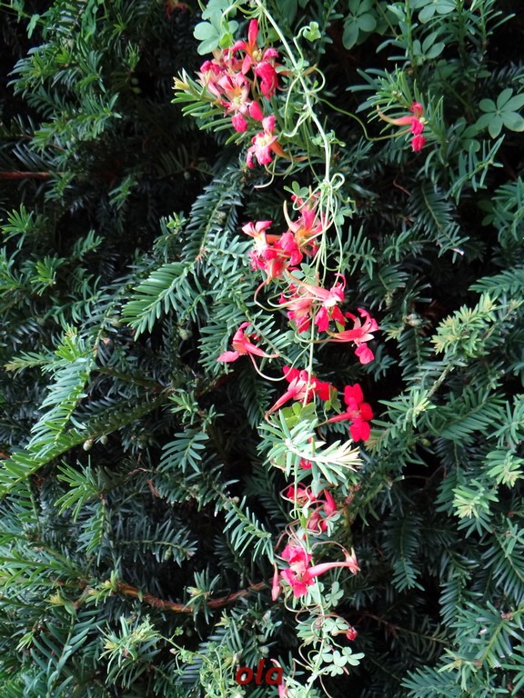 Na cisowym żywopłocie pnie się nasturcja pnąca . Ta delikatna bylina zdobi ciemną zieleń cisa . Sięga 3 metrów wysokości a kwitnie od VI do IX .