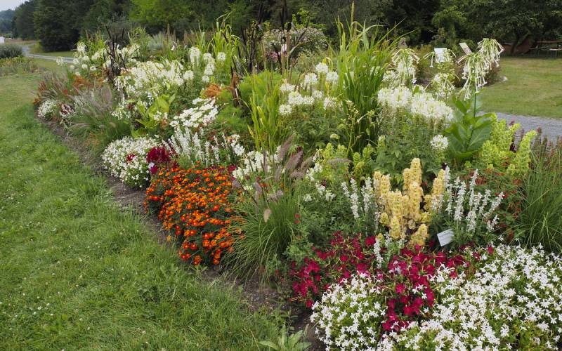 Zaczyna się od typowych letnich rabat, a wejście znajduje się przy szklarniach.