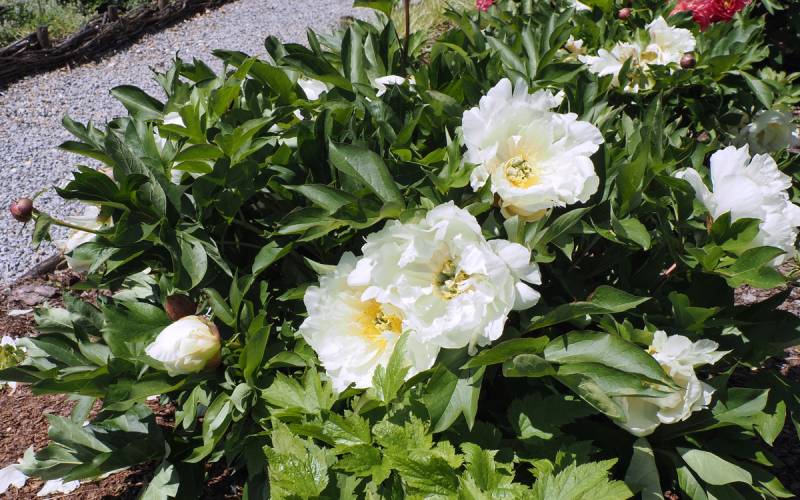 Hodowca: Seidl, USA, 1989 Kwiaty: białe, półpełne (Ø 18-20 cm) pręciki kremowe, słupki jasnoszare z kremowymi końcówkami Wysokość: około 60 - 70 cm Pędy: mocne, sztywne, krzew jako całość tworzy idealną roślinę ogrodową Liście: bujne ciemnozielone, mocno wcięte, sztywne; jesienią mogą się ładnie przebarwiać Termin kwitnienia: przełom maja i czerwca