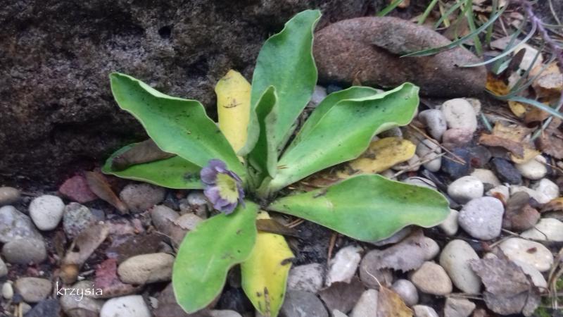 Prezent od Ani/Annawu recourse Leszek powiedział, że omszony i ma mieć wapienną ziemię i wilgoć, posadziłam go więc u stóp tworzącego się skalniaka, zakwitł hu_rra ale dlaczego żółkną mu listki :nie_wiem .