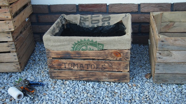 Skrzynki są wyłożone agrotakniną. Z worków jutowych wyciełąm tylko paski i obiłam nimi górę, dla efektu estetycznego.