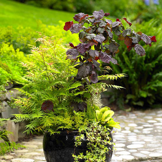 Nie myśl, że ogrody są ograniczone do donic z nasadzeniami jednorocznymi - można użyć drzew i krzewów, aby uzyskać odważny efekt. Oto, na przykład, tawlina jarzębolistna 'Sem' jest wspaniałym zestawieniem z bordowymi liśćmi orzecha laskowego 'Red Majestic'.
