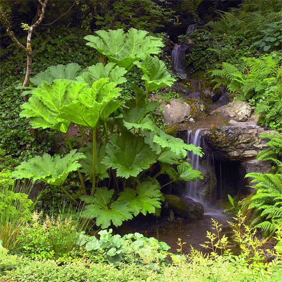 Uwaga: Nie wszędzie można zastosować gunnerę, w naszym klimacie jest wymagająca co do zimowania. Można jednak użyć innych roślin: hibiskusów, lilii orientalnych, sadźców konopiastych, ostróżek, wysokich rudbekii, parzydła leśnego, wiązówki czerwonej, kanny, miskantów czy malw.(przyp. D.)