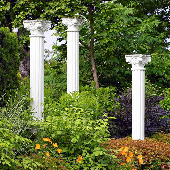 Nadaj krajobrazowi kilka wysokich punktów - w tym przypadku, Brian pokazał trzy wysokie inspirowane klasycyzmem kolumny betonowe, które stoją niczym wykrzykniki. "Chodzi o to, aby podnieść wzrok z ziemi", mówi Brian. "Filary tworzą poczucie starożytności i dodają element zaskoczenia i tajemnicy." Scena ta jest uderzająca w lecie, kiedy otaczający ogród mieni się w kolorze białym tawułek, pluskwicy oraz bratków i srebrzystych miskantów.