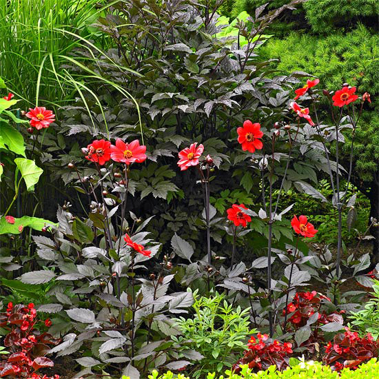 Twój ogród zyska na dodatku roślin z ciemnymi bordowymi liśćmi, które wyglądają (na tle innych) niczym czarne. "Czarne liście tworzą magiczne kombinacje w ogrodzie", mówi. "Wystarczy spojrzeć na te ciemne liście begonii czy dalii.