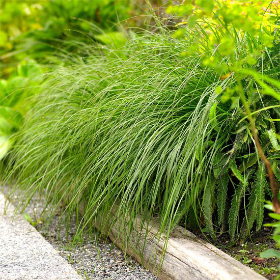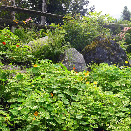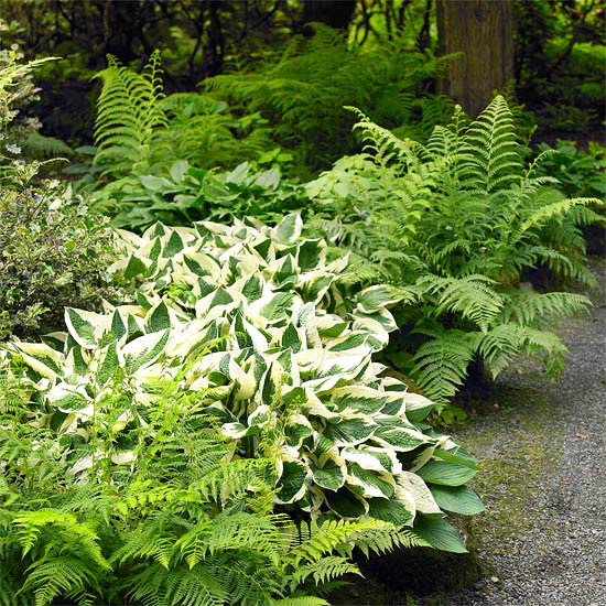Wielka, rozłożysta Gunnera czuje się jak w naturze nad zalesionym strumieniem i wodospadem, dodaje dramatyzmu i stwarza obraz w ogrodzie. Brian używa wielkich bylin wieloletnich - do zmiany skali rzeczy, to coś na podobieństwo dodania wieżowca do panoramy miasta. Tawułki i tulejniki ("kapusta skunksa") podkreślają i uzupełniają scenę.