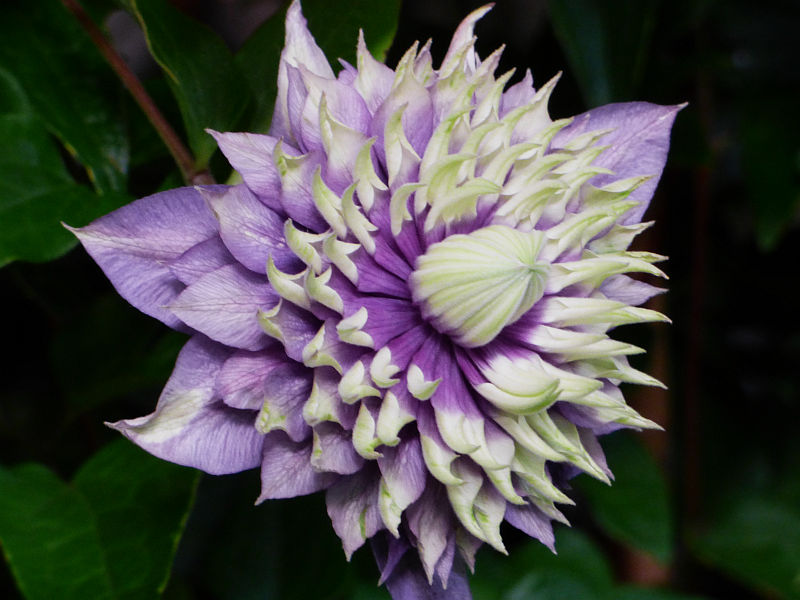 Kwiaty: pełne, fioletowoniebieskie z żółtozielonymi końcami działek... zmienne w kształcie... średnica powyżej 12 cm... kwitnie VI-IX