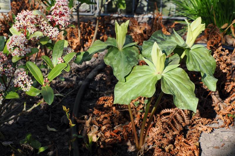 Budzi się Trillium chloropetalum. Stanowisko wiosną ma słoneczne, później półcień.