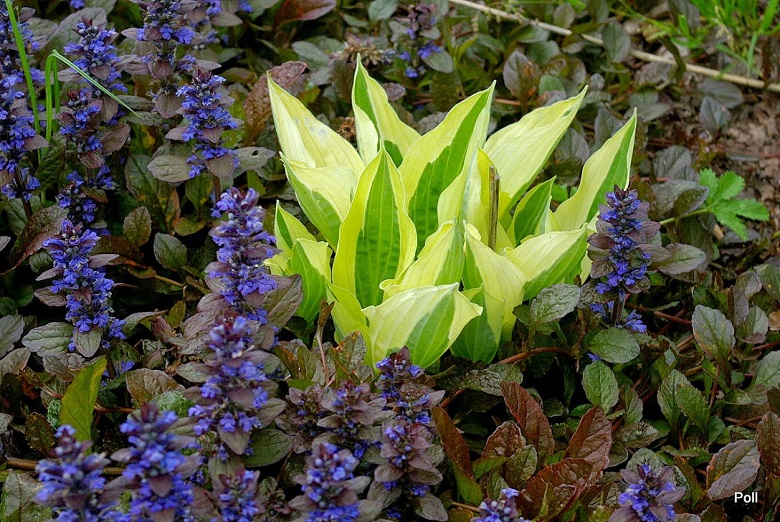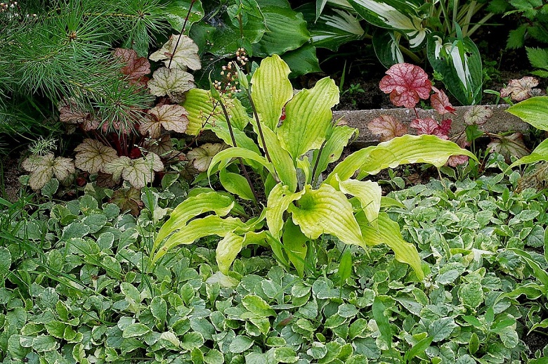Hosta Yellow Polka Dot Bikini wśród dąbrówek rozłogowych