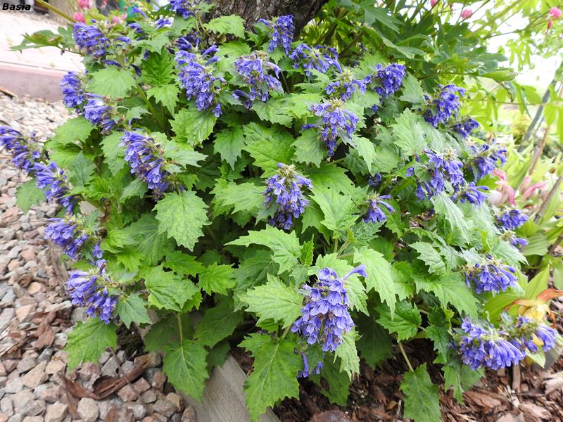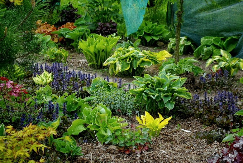 Szerszy widok na hosty i dąbrówki na skraju rabat