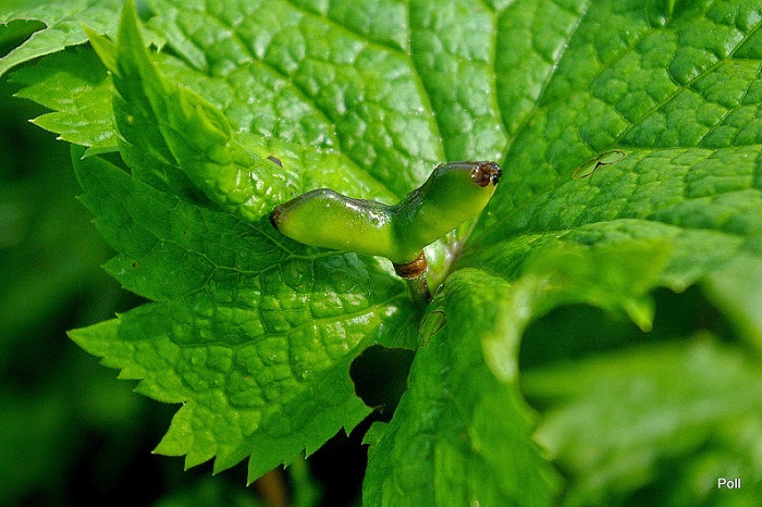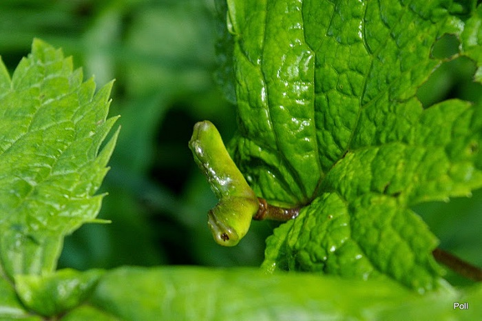 Liście glaucidium są jasnozielone i chropowate. W kształcie dłoniaste, z pięcioma 'wydzielonymi palcami' , klapowane i wyraźnie ząbkowane a - szczególnie na spodzie - widzimy ich unerwienie.