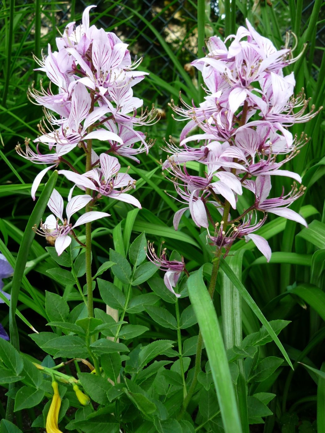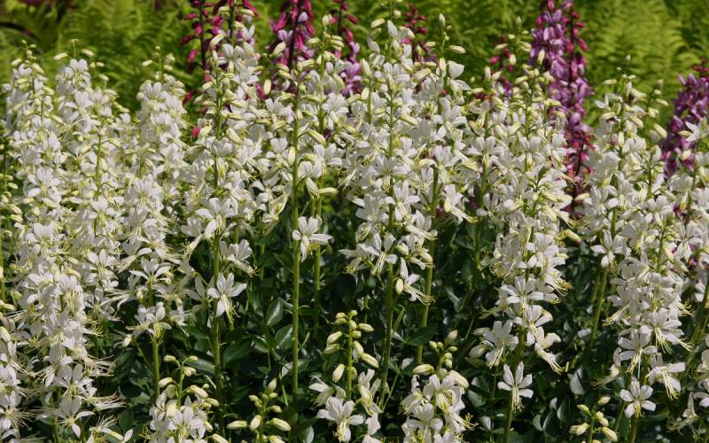 Kwiaty różowe i białe, z ciemniejszymi żyłkami, zebrane w grona na szczytach łodyg.