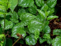 Liście: sercowate, naprzeciwlegle ułożone na 3cm ogonkach. Piłkowane, owłosione, zielone lub z białymi plamami.