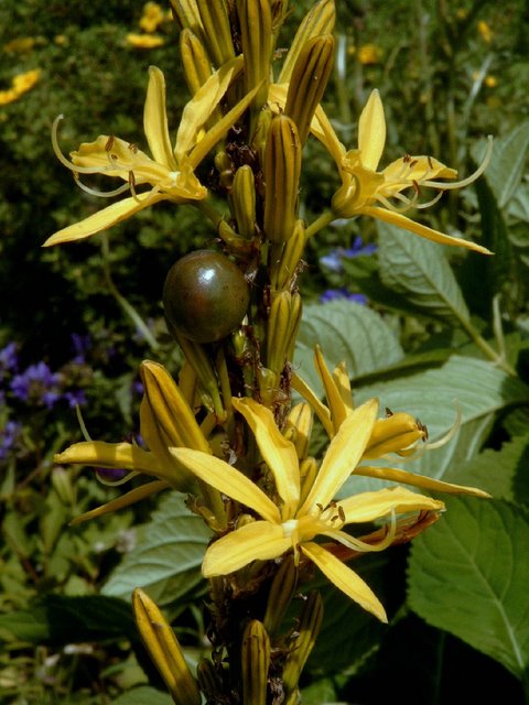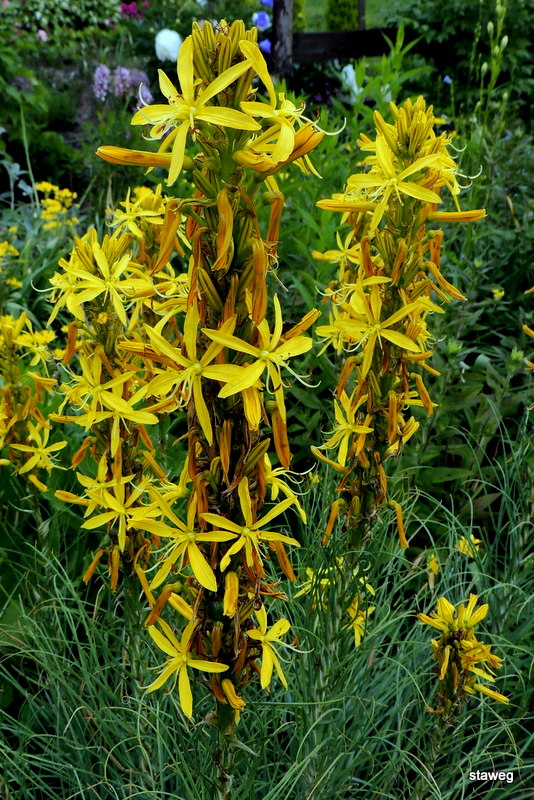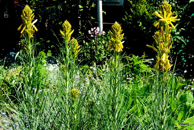 Asphodeline lutea kupiłam wiosną tego roku, jako małą sadzonkę. Posadziłam w dużej donicy i zadołowałam na słonecznej rabacie. Nie zakwitła, ale bogato się rozrosła przez krótkie rozłogi