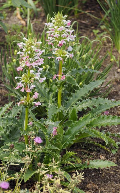 Na szczytach pędów wyrasta kłosokształtny kwiatostan zbudowany z okółków kwiatowych pod którymi znajdują się kolczaste podkwiatki.