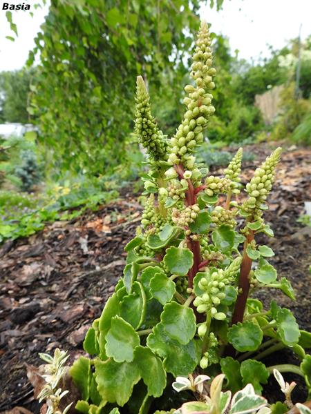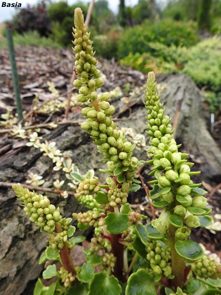 Wysokość: 15-30cm Liście: zielone, mięsiste, tarczowate z zagłębieniem w środku Kwiat: VI-VIII 8-10mm długości,dzwonkowaty, kolor zmienia się od zielonkawo kremowego do różowego Stanowisko: słoneczne lub półcieniste Gleba: przepuszczalna, wilgotna, kwaśna