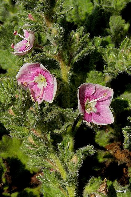 Kwiaty różowe, czteropłatkowe, przeważnie na końcach pędów. Pojawiają się od kwietnia, nawet do lipca.