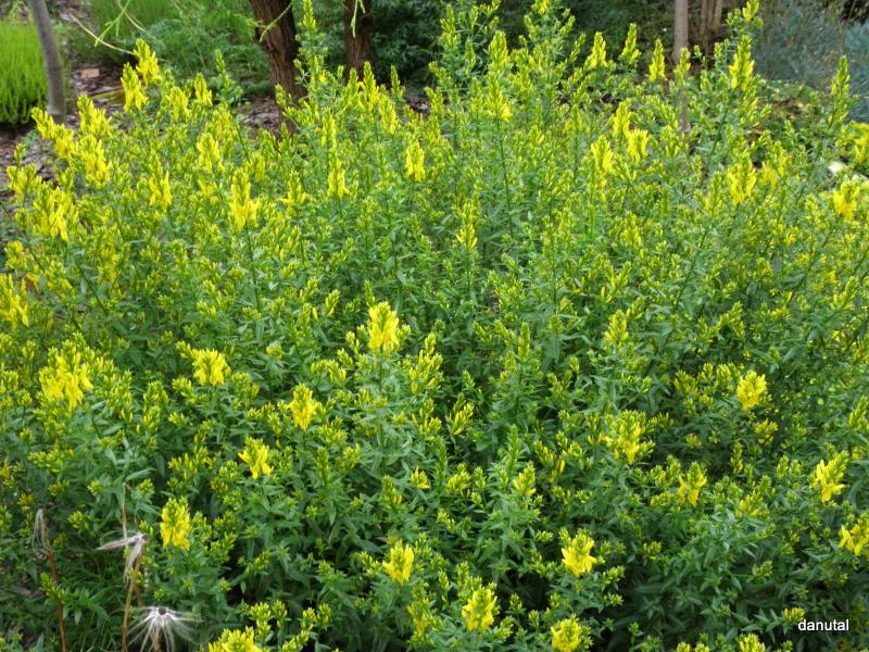 Pochodzący z Bałkanów niski (do 0,5m wys.) ścielący się krzew o niebiesko-zielonych, wiotkich pędach. Kwiaty motylkowe, złocisto-żółte, bardzo gęsto pokrywające całą roślinę końcem maja.