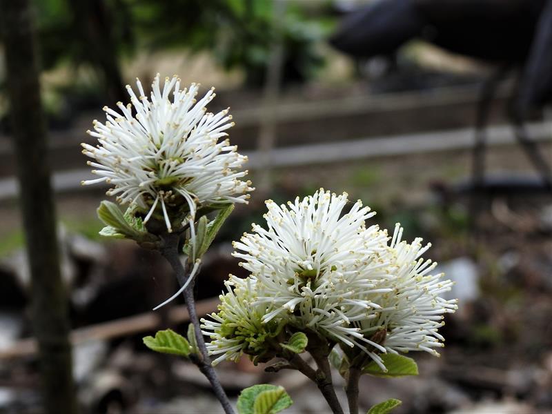Kwitnie zeszłoroczy zakup Fothergilla gardenii 'Blue Mist' karłowa odmiana dorastająca do 0,8 m wysokości.