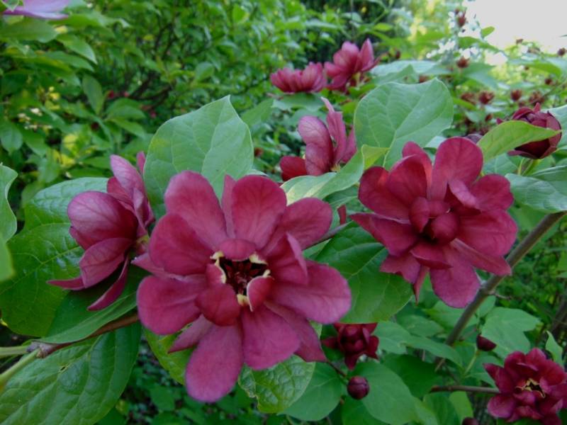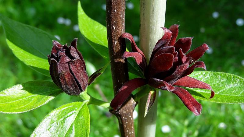 Calycanthus floridus). Ten interesujący, choć dość rzadko spotykany w ogrodach krzew ozdoby, posiada nie tylko ciekawe kwiaty i przebarwiające się jesienią na żółto liście, ale też zachwyca dość mocnym, charakterystycznym aromatem, przypominającym zapach jabłek i goździków.