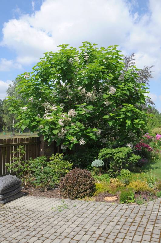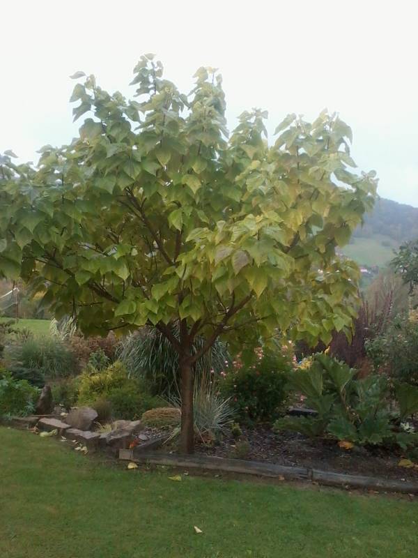 Katalpę bignoniową miałam od wielu lat , wiele razy złamana była i podmrożona . W tym roku została ścięta , bo korniki się już za nią zabrały , ale mam jeszcze dwie takie uformowane na drzewka i co roku przycinane . To dwie pierwsze . Trzecia to Aurea , bardzo ładna ,korona rośnie wolno , ale pień przyrasta szybko . Czwarta to chyba Ovata , czyli żółtokwiatowa .
