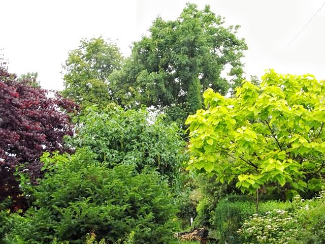 Jest jeszcze Purpurea kupiona późną wiosną , ogołocona z nowych przyrostów , bo sosna czarna się złamała i uszkodziła ją i platana , hostom się udało co rosły najniżej . W miarę się odbudowała .Katalpa pośrednia 'Purpurea' powstała w Anglii w 1886 roku w wyniku skrzyżowania C. bignonioides z C.ovata .