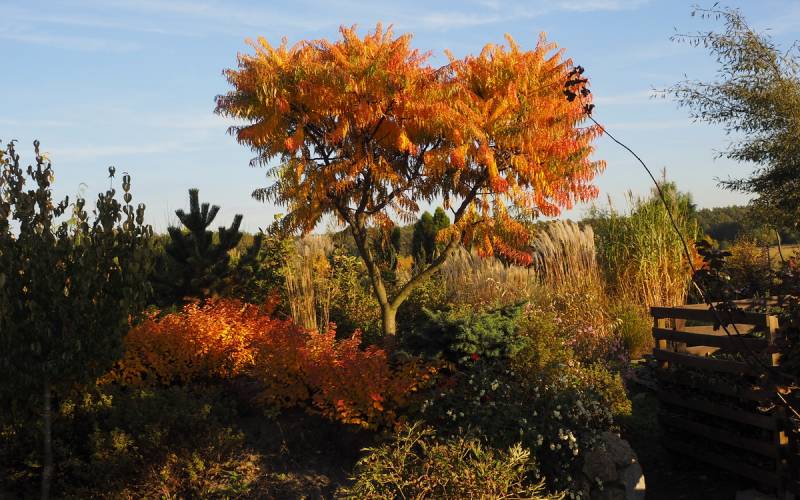 Rhus typhina, spotkać możemy w ogrodach sumaki odmianowe, różniące się kształtem i kolorem liści: