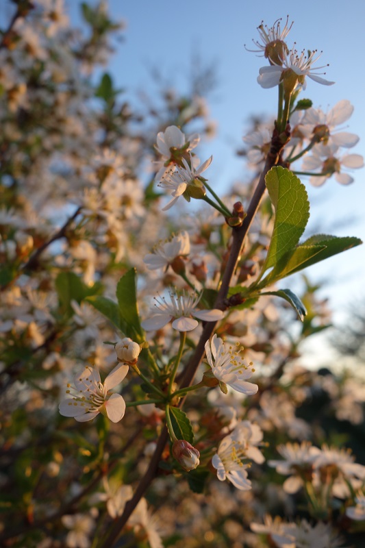 Liście drobne, ciemnozielone. Kwitnie kwiecień-maj. Kwiaty małe białe.