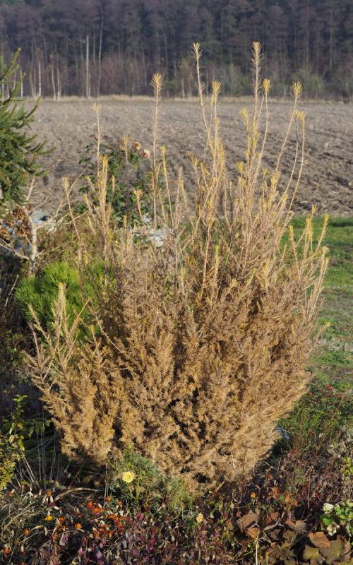 Stożkowy, wąski. Dorasta do 20 m wysokości. Rośnie dość powoli. Korona wąska, gałęzie krótkie, nieco zadarte do góry.