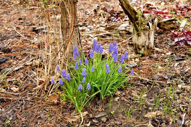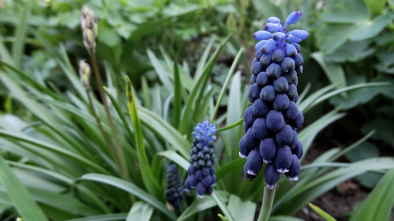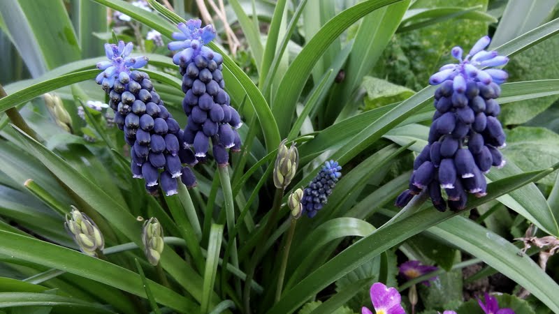 Szafirki armeńskie rosną w półcieniu hostowiska, ale gdy kwitna, jeszcze nie ma liści na drzewach. Gdy przekwitają, hosty już rosną w siłę i zasłaniają to, co najbardziej mnie denerwuje po kwitnieniu, czyli kupę liści. Kocham ich zapach. :tup
