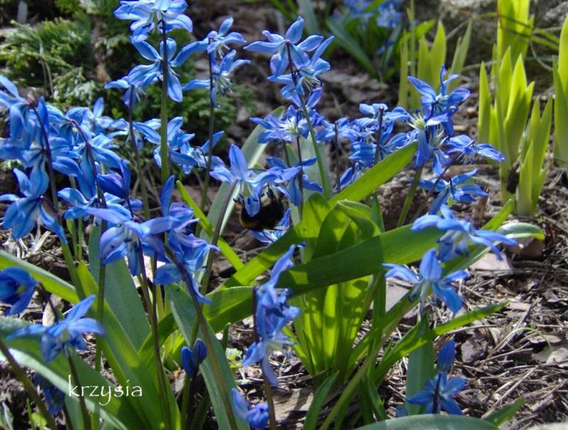 Scilla siberica na słonecznym stanowisku (latem półcieniste, obficie podlewane)