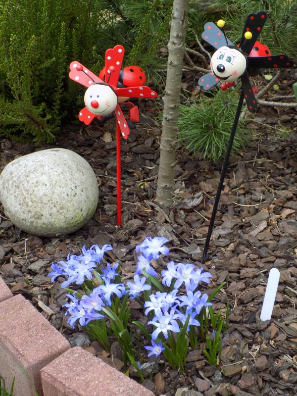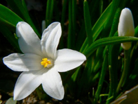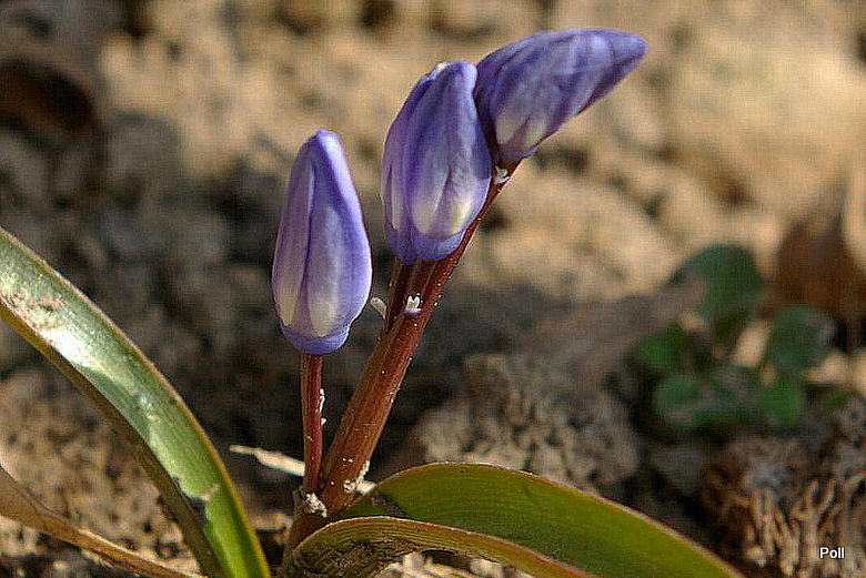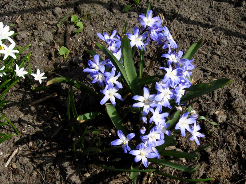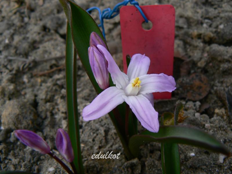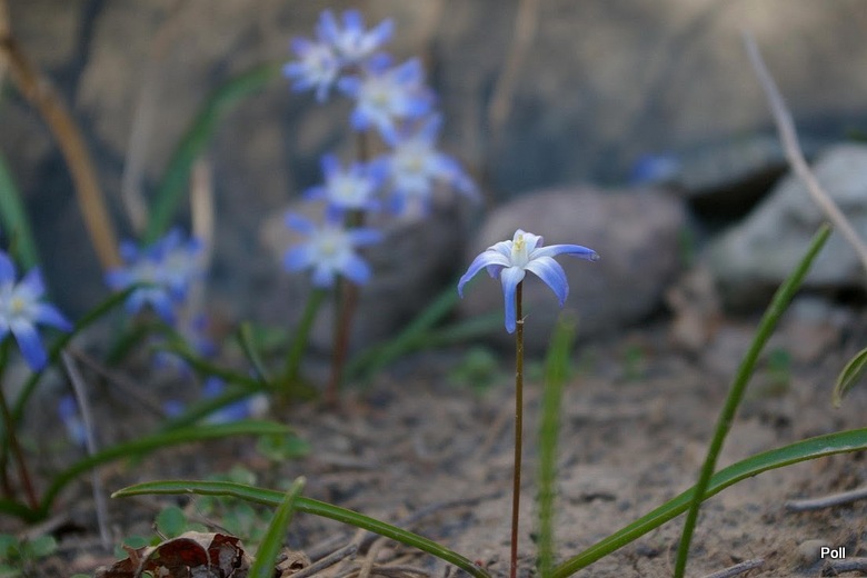 • Śnieżnik lśniący (Chionodoxa luciliae); 2–3 kwiatki na łodyżce; w środku kwiatka niewielkie białe oczko, rozmyte na brzegach (pochodzi z zachodniej Turcji, z okolic Izmiru)