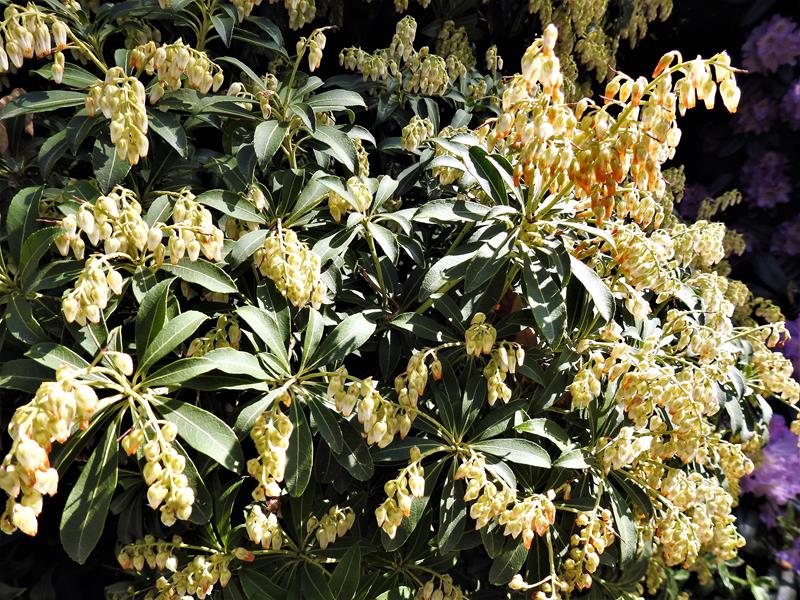 ---> Pieris kwiecisty (amerykański)... niższy od omawianego... o liściach osadzonych skrętolegle i kwiatostanach wzniesionych do góry... wyższej mrozoodporności... w Polsce uprawiany rzadziej