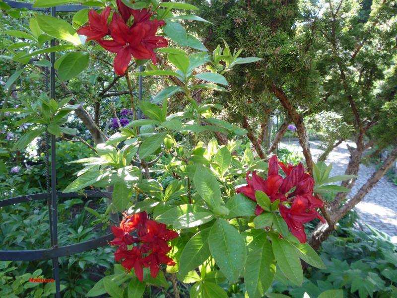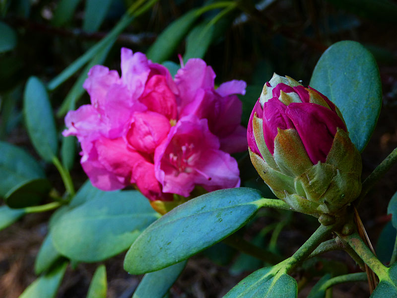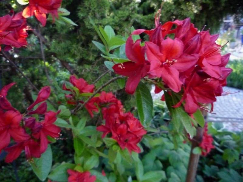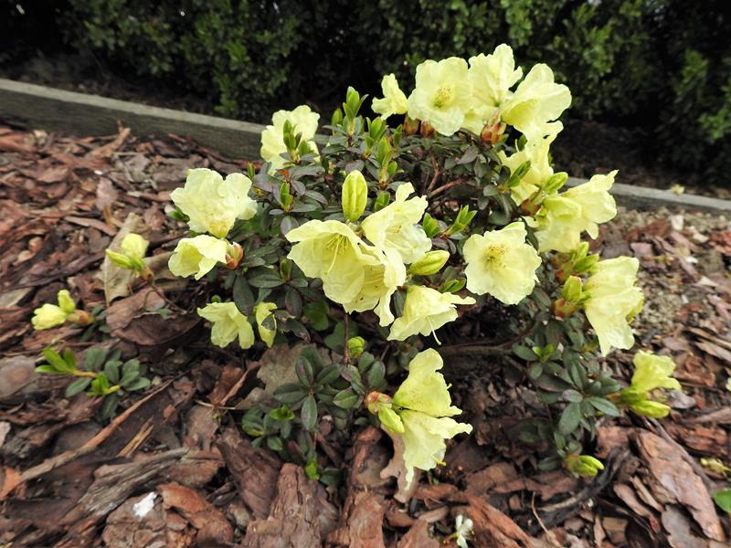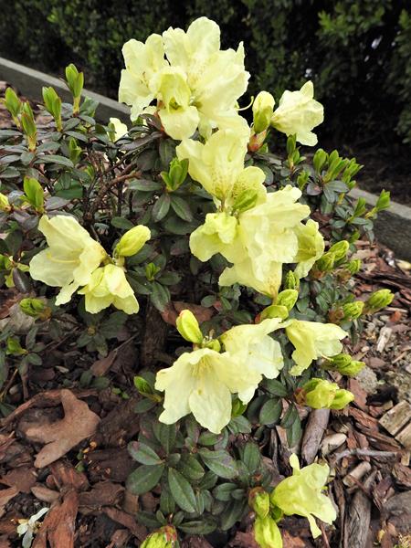 Rhododendron ludlowii albo któraś z jego odmian 'Wren' albo 'Curlew'... 'Wren dorasta po 10 latach do hen... 20 cm przy 40 cm szerokości...